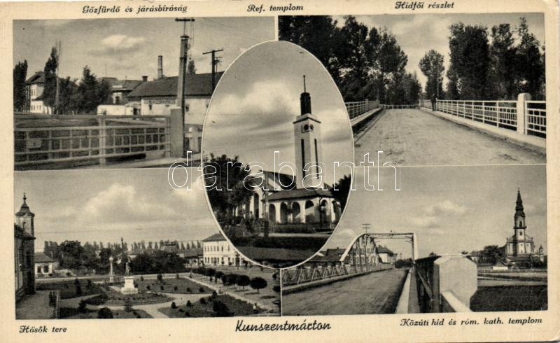 Kunszentmárton, Gőzfürdő és járásbíróság, templom, Hídfő, Közúti híd, ... https://www.darabanth.com/hu/186-Gyorsarveres/186.0/Kepeslapok/Magyarorszag~8000010/Kunszentmarton-Gozfurdo-es-jarasbirosag-templom-Hidfo-Kozuti-hid-Hosok-tere-E~II683991