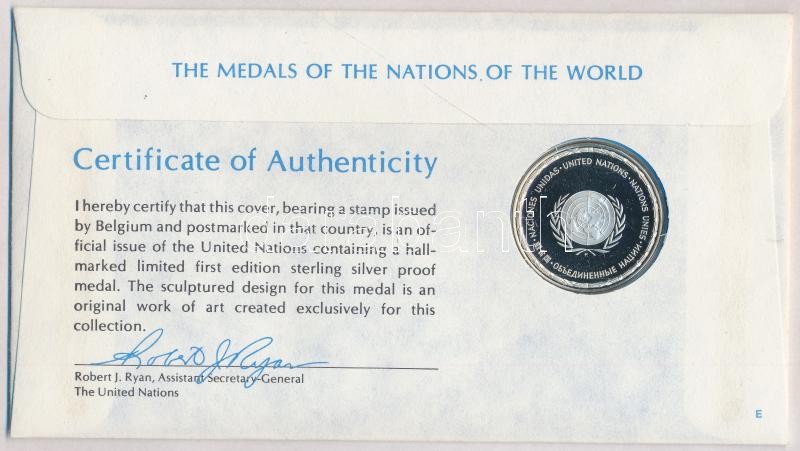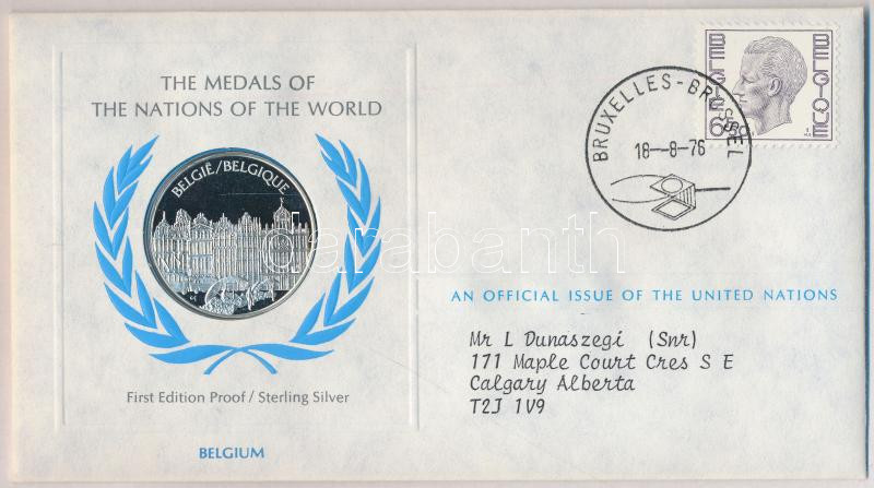 ENSZ 1976. "A Világ nemzeteinek emlékérmei - Belgium Ag emlékérem (15g/0.925/32mm) megcímzett érmés borítékon elsőnapi bélyegzős bélyeggel, hátoldali tanúsítvánnyal, ismertetőkkel T:PP