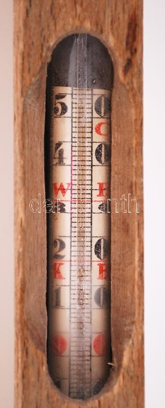 Leírás: régi hőmérő, fatokban, 20,5cm