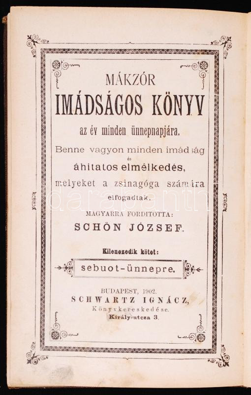 Leírás: Mákzor Imádságos Könyv, az év minden napjára. Magyarra fordította: Schön József. Scheartz Ignác könyvkereskedése, Budapest, 1902. 9. köt. Sebuot-ünnepre. Dombornyomott műbőr kötésben.