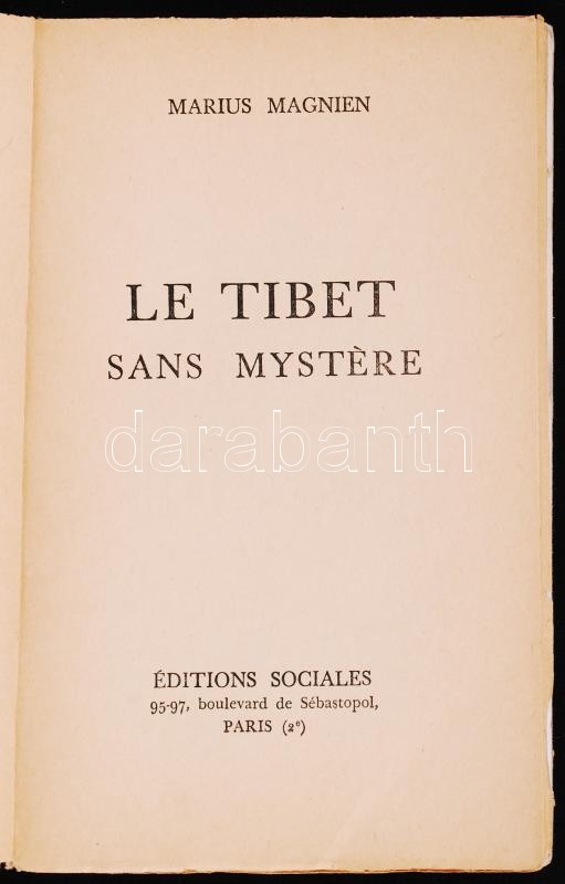 Leírás: Marius Magnien: Le Tibet sans mystére. Éditions sociales 1959. Francia nyelvű, felvágatlan kötet, szöveg közti képekkel.