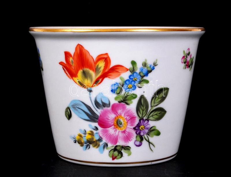 Leírás: Virágokkal díszített, kézzel festett és aranyozott, jelzett Herendi kaspó /
