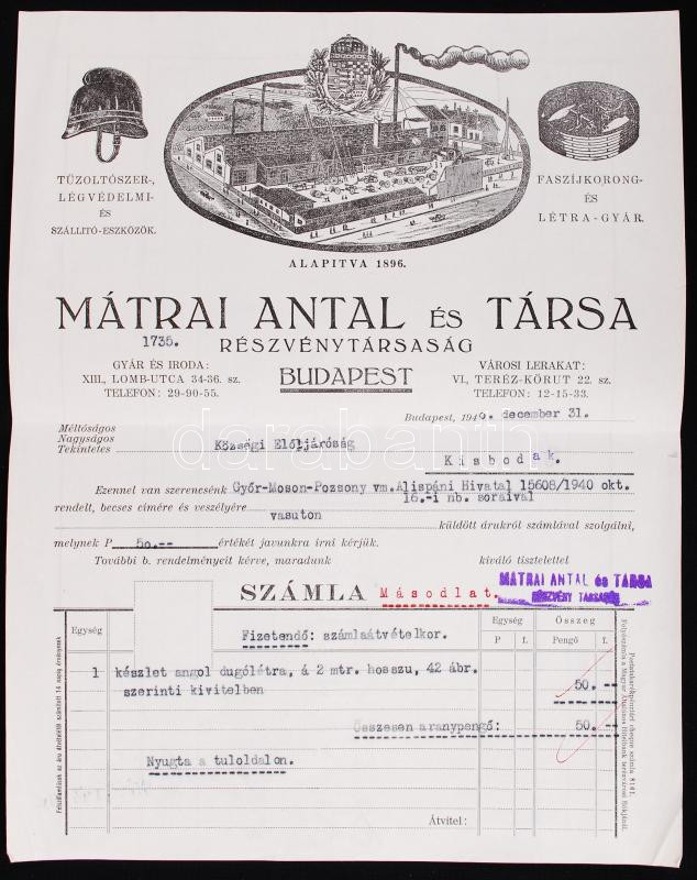 Leírás: Fejléces számla, Mátrai Antal és Társa Rt, 29×20 cm