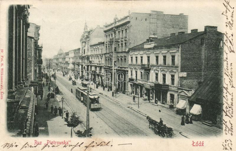 Lodz, Piotrkowska street, tram, shops (fa) https://www.darabanth.com/hu/187-Gyorsarveres/187.0/Kepeslapok/Lengyelorszag~1000077/Lodz-Piotrkowska-street-tram-shops-fa~II688475
