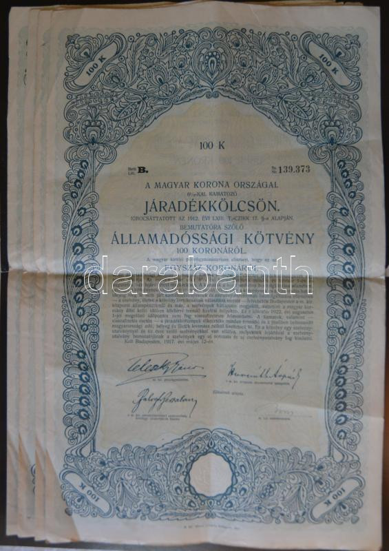 Budapest 1917. "A Magyar Korona Országai 6%-kal kamatozó Járadékkölcsön- államadóssági kötvénye 100K-ról." szelvényekkel, egymást követő sorszámok (4x) T:III