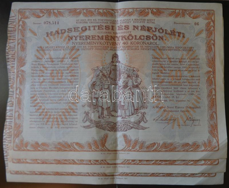 Leírás: Budapest 1917. "Hadsegítési és Népjóléti nyereménykölcsön" nyereménykötvény 40K-ról, egymást követő nyereményszámok (3x) T:II-
