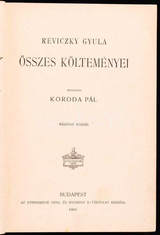 Reviczky Gyula: Összes költeményei. Rendezte: Koroda Pál. 2. kiadás. B... https://www.darabanth.com/hu/188-Gyorsarveres/188.0/Festmeny-mutargy-papirregiseg-egyeb/Konyvek-Egyeb-ritkasagok~15000040/Reviczky-Gyula-Osszes-koltemenyei-Rendezte-Koroda-Pal-2-kiadas-Budapest-1900-Athenaeum~II697848