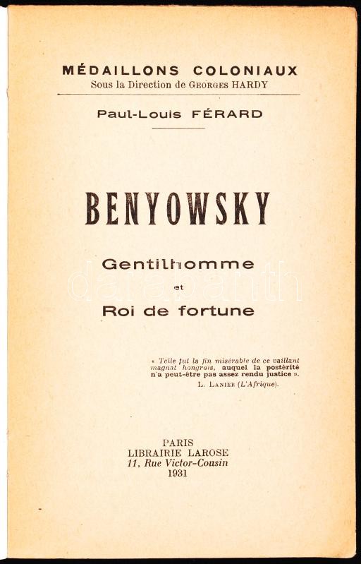 P. L. Ferard: Benyowsky. Gentilhomme et Roi de fortune. Paris, 1931, L... https://www.darabanth.com/hu/188-Gyorsarveres/188.0/Festmeny-mutargy-papirregiseg-egyeb/Konyvek-Utazas-varosok~15000027/P-L-Ferard-Benyowsky-Gentilhomme-et-Roi-de-fortune-Paris-1931-Librairie-Larose-Fuzve-papi~II697777