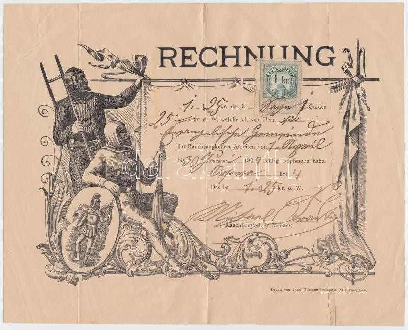 Leírás: 1894 Kéményseprő számla 1kr illetékbélyeggel