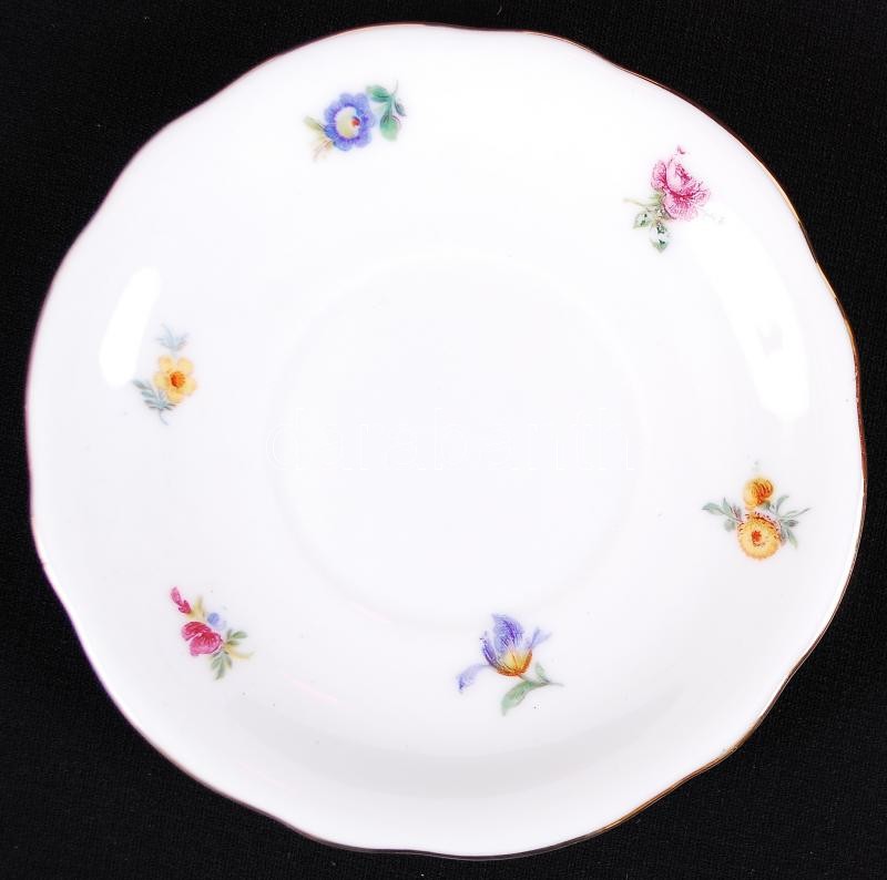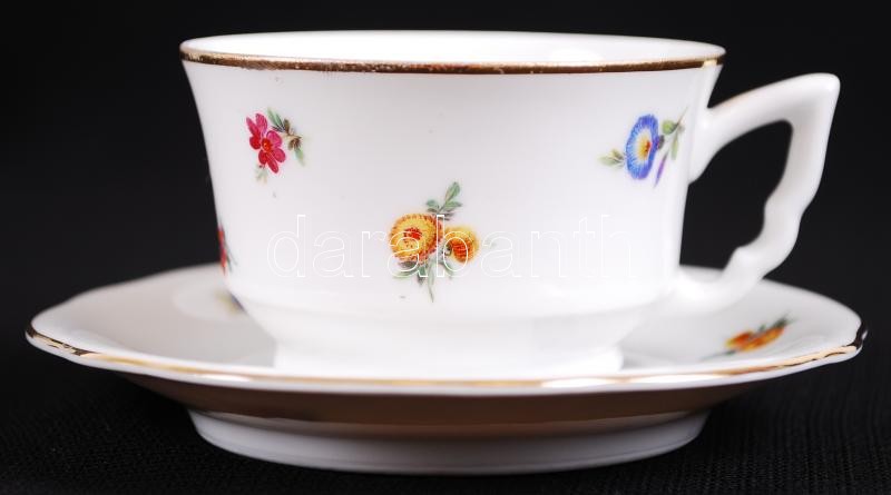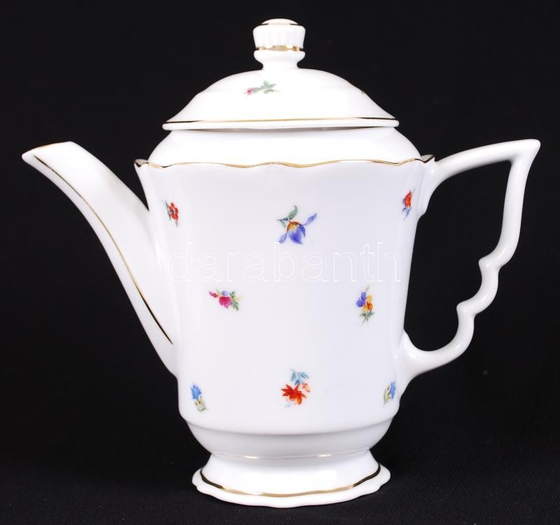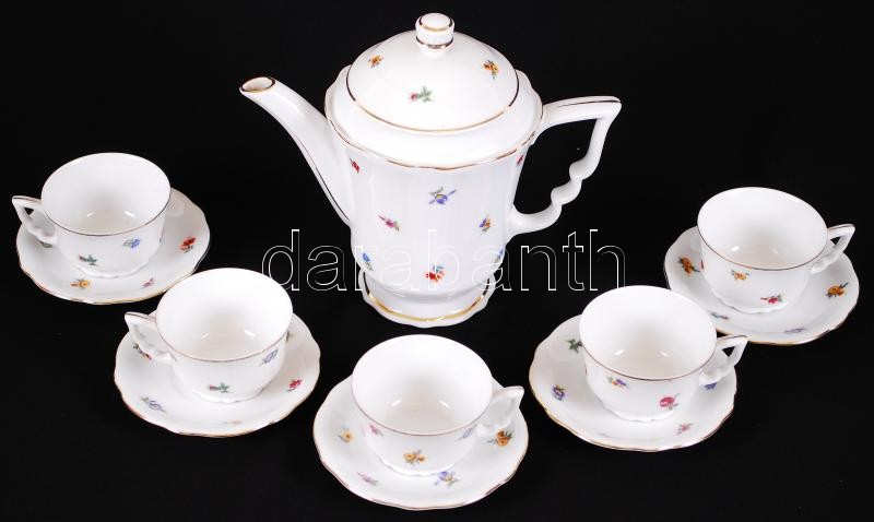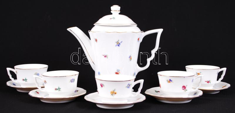 Leírás: Hiányos, jelzett, pajzspecsétes Zsolnay kávéskészlet: 1db kiöntő, 5db kávéscsésze alátéttel. Virágmintás, aranyozott szegéllyel / Incomplete, marked, Zsolnay porcelain coffee set: 1 coffee pot and 5 cup with saucer
