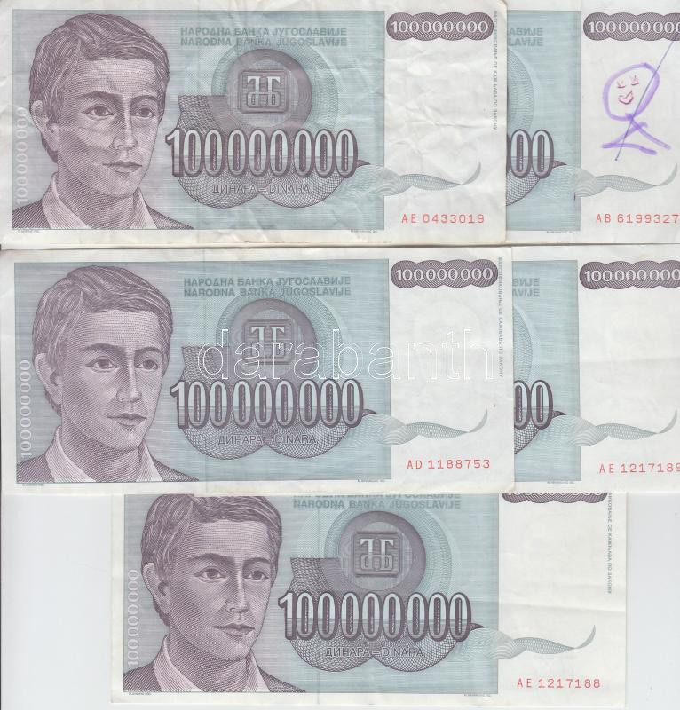 Yugoslavia 1993. 100.000.000... https://www.darabanth.com/hu/188-Gyorsarveres/188.0/Numizmatika/Kulfoldi-bankjegyek~300011/Jugoszlavia-1993-100000000D-5x-TIII-3Cbr3EYugoslavia-1993-100000000-Dinara-5x-CF-3Cbr3E~II701079