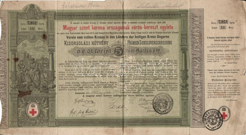 Leírás: Budapest 1882. "Magyar szent korona országainak vörös-kereszt egylete" Kisorsolási kötvény 5Ft-ról osztrák pecséttel T:III