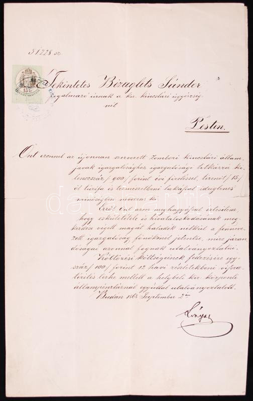 Leírás: 1868 Lónyay Menyhért (1822-1884) aláírása kinevezési okmányon