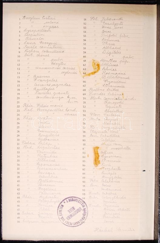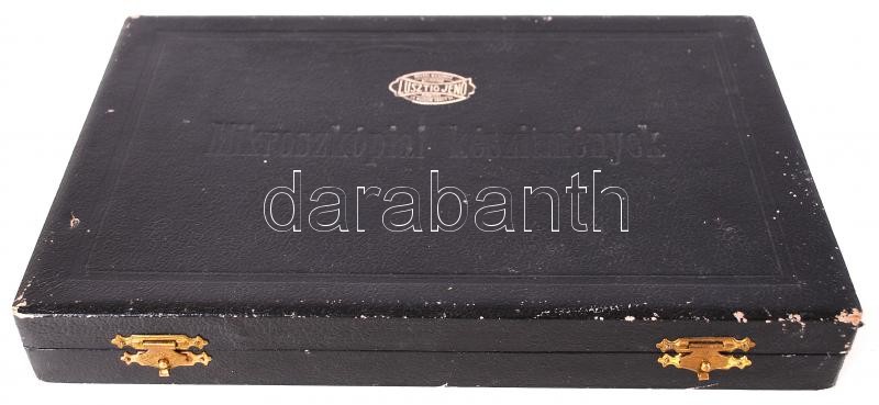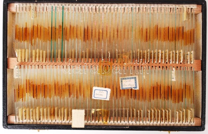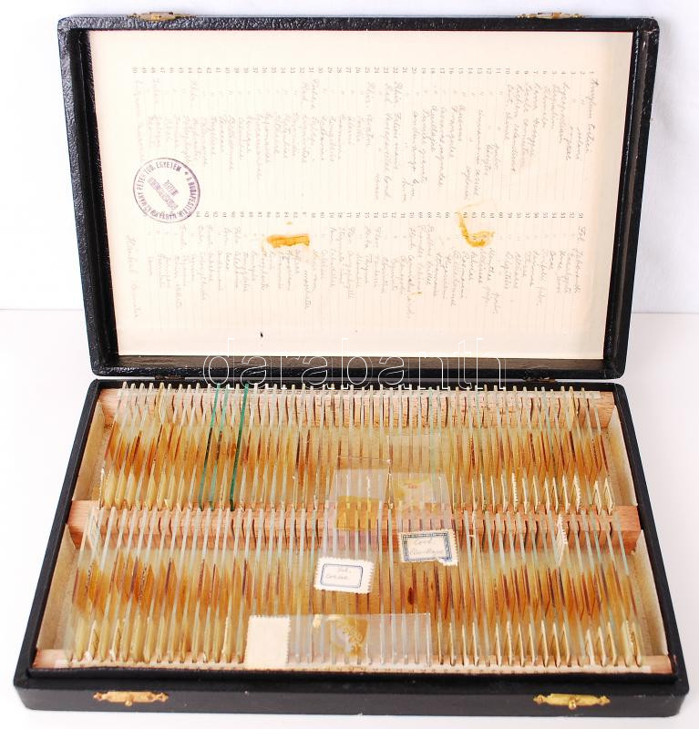 Cca 1920 "Mikroszkópiai készÃtmányek", készÃtÅ‘: Lusztig JenÅ‘. A budapesti Kir. Magyar Pázmány Péter Tud. Egyetem Gyógyszerészeti Intézetének pecsétjével jelzett, 100db különféle mintát tartalmazó készlet (latin nevekkel), eredeti dobozban
