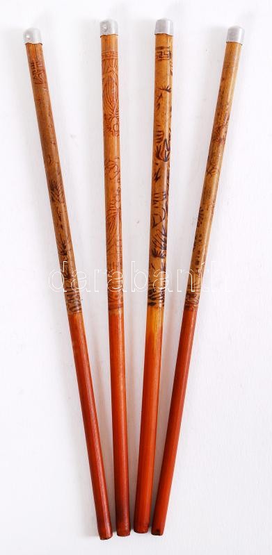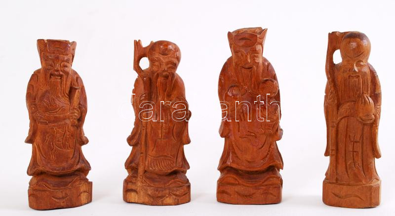 Leírás: Faragott fa kínai szobrok 4 db, fa evőpálcák