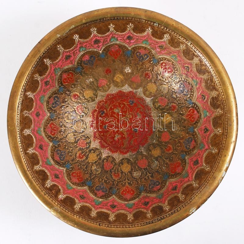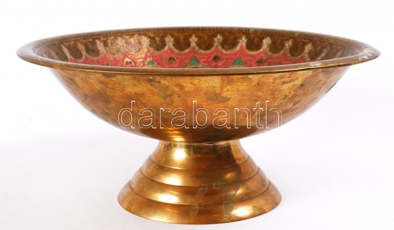 Leírás: Zománcozott talpas réz kínáló, d:30 cm, m:13 cm