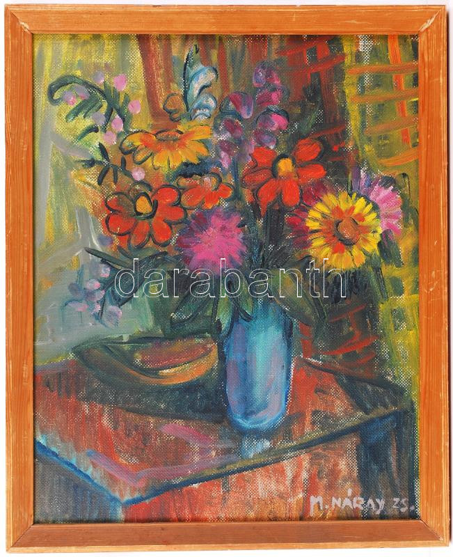 Leírás: M. Náray Zsuzsa: Virágok. Olaj, farost, jelzett, keretben, 53×42 cm