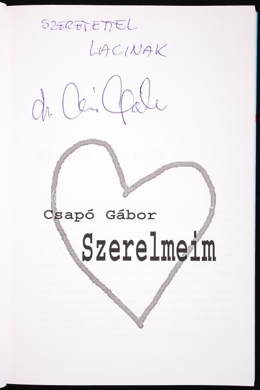 Csapó Gábor: Szerelmeim. Dedikált! Budapest 2006. Absolut Media. https://www.darabanth.com/hu/189-Gyorsarveres/189.0/Festmeny-mutargy-papirregiseg-egyeb/Konyvek-Egyeb-ritkasagok~4000039/Csapo-Gabor-Szerelmeim-Dedikalt-Budapest-2006-Absolut-Media~II705324