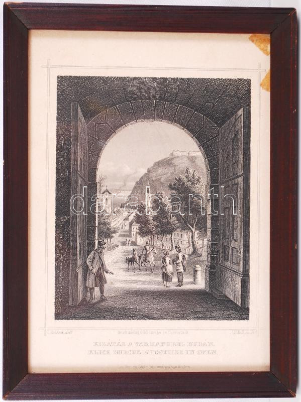 cca 1850 Ludwig Rohbock (1820-1883) - J. M. Kolb: Kilátás a Várkapuból Budán. Blick durchs Burgthor in Ofen. Acélmetszet, jelzett, üvegezett keretben /