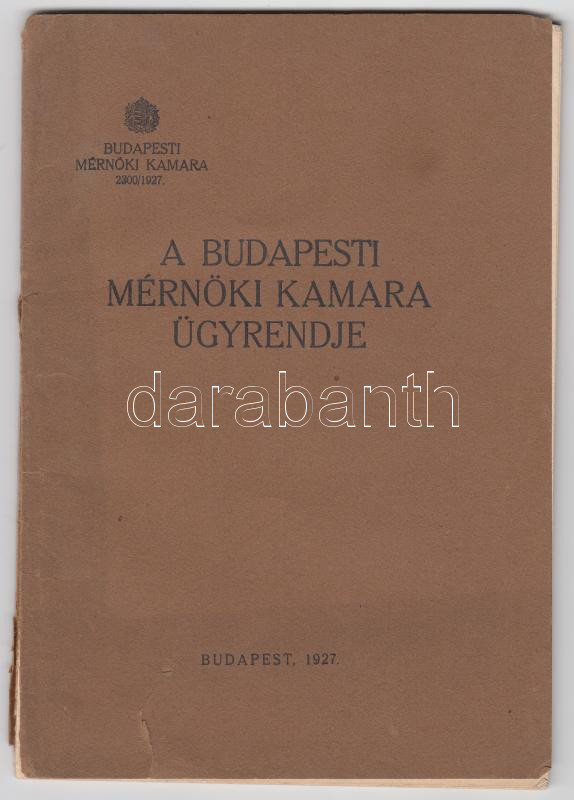 1927 A Budapesti Mérnöki Kamara ügyrendje 60p. https://www.darabanth.com/hu/189-Gyorsarveres/189.0/Festmeny-mutargy-papirregiseg-egyeb/Nyomtatvanyok~4000025/1927-A-Budapesti-Mernoki-Kamara-ugyrendje-60p~II712008