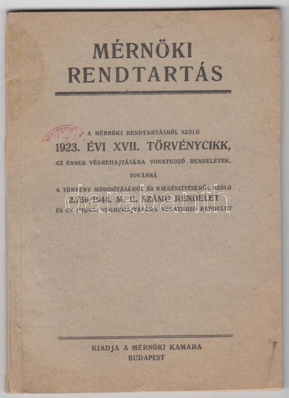 Mérnöki Rendtartás. Bp., 1944 Budapesti Mérnöki Kamara 88p. https://www.darabanth.com/hu/189-Gyorsarveres/189.0/Festmeny-mutargy-papirregiseg-egyeb/Nyomtatvanyok~4000025/Mernoki-Rendtartas-Bp-1944-Budapesti-Mernoki-Kamara-88p~II712009