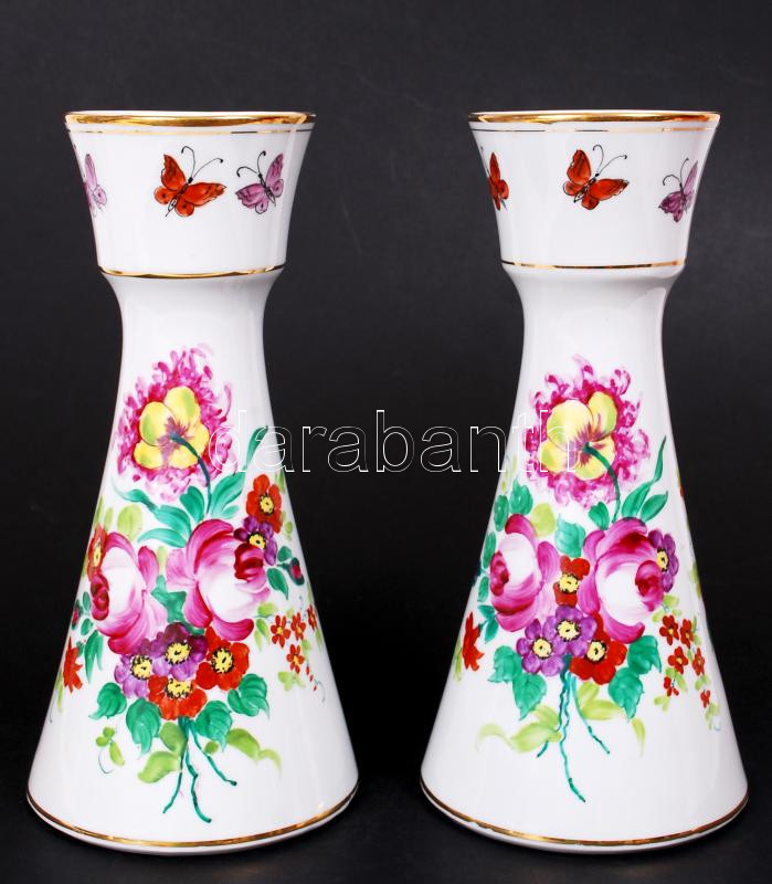 Leírás: Jelzett, kolozsvári Iris porcelán vázapár, kézzel festett, néhol apró kopásokkal. M: 26 cm