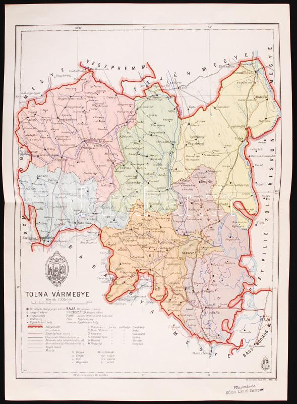 Leírás: 1941 Magyar Földrajzi Intézet Rt: Tolna Vármegye 29×27 cm