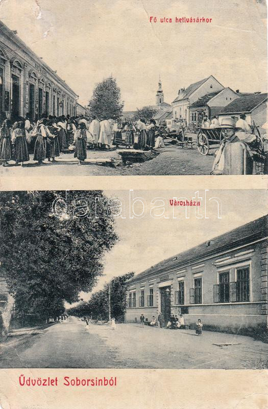 Soborsin town hall, main street, market (b) https://www.darabanth.com/hu/189-Gyorsarveres/189.0/Kepeslapok/Erdely~900007/Soborsin-town-hall-main-street-market-b~II707800