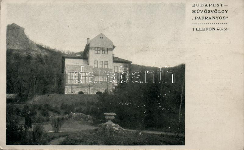 Budapest II. Hűvösvölgy, Páfrányos-villa, hátoldalon reklám https://www.darabanth.com/hu/189-Gyorsarveres/189.0/Kepeslapok/Magyarorszag~900006/Budapest-II-Huvosvolgy-Pafranyos-villa-hatoldalon-reklam~II710770