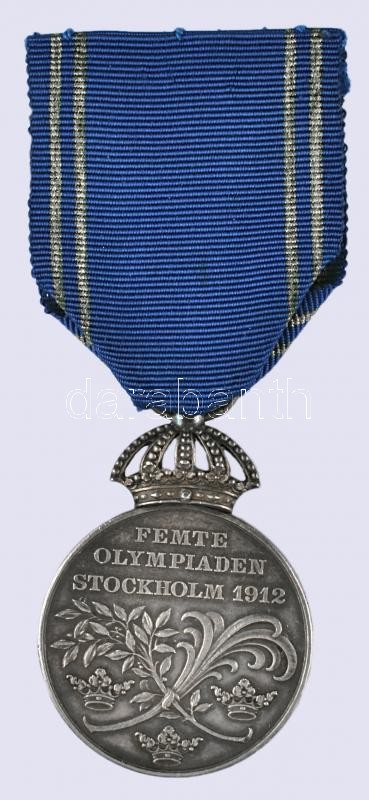 Svédország 1912. Stockholmi Olimpia ezüst érdemérem szalaggal "V. Gusztáv" (15.6g/31mm) szignó: A Lindberg T:2