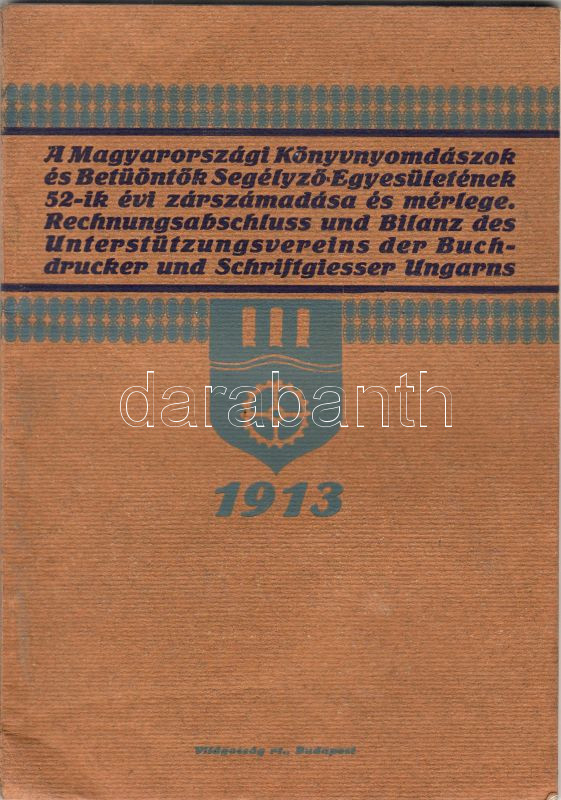 Leírás: A Magyarországi Könyvnyomdászok és Betüöntők Segélyező Egyesületének 52-ik évi zárszámadása és mérlege; Budapest 1913 Világosság Rt