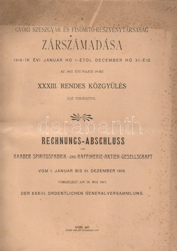 Győri szeszgyár és finomító Rt. zárszámadása 1916 évről; Győri hirlap ... https://www.darabanth.com/hu/19-Gyorsarveres/19.0/Festmeny-mutargy-papirregiseg-egyeb/Nyomtatvanyok~87/Gyori-szeszgyar-es-finomito-Rt-zarszamadasa-1916-evrol-Gyori-hirlap-nyomdaja~II35348