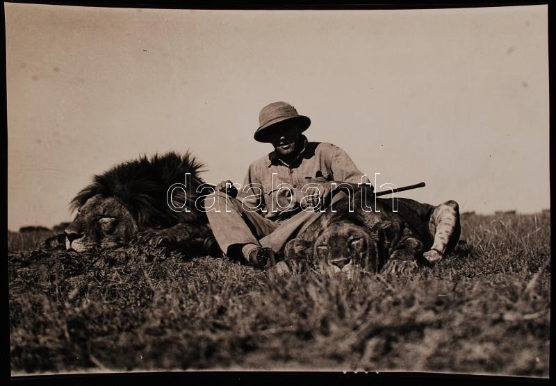 Leírás: 1934 Széchenyi Zsigmond (1898-1967) vadász és író, afrikai vadászaton elejtett két oroszlánnal, későbbi másolat az eredeti üveglemezről, 13x18 cm