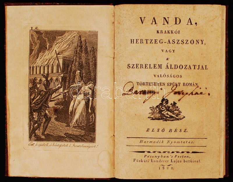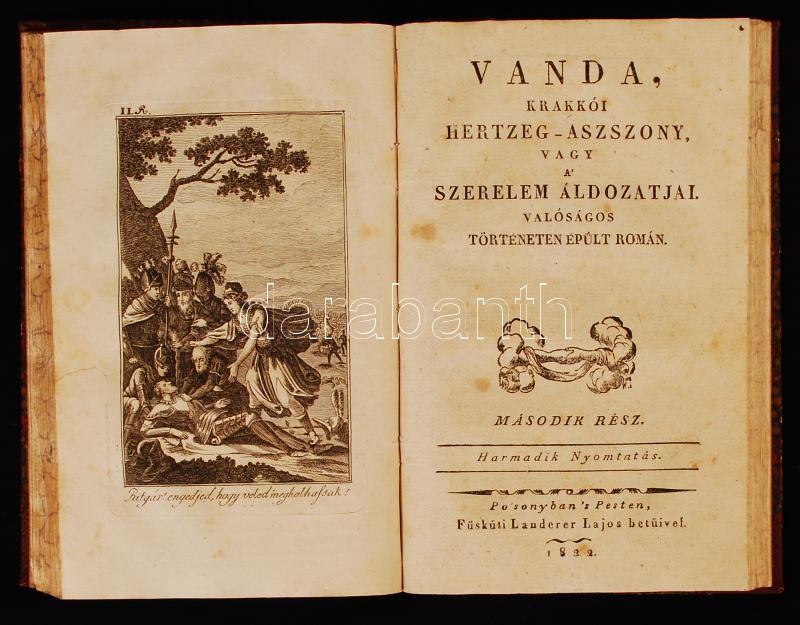 Leírás: Vanda, krakkói hertzeg-aszszony, vagy a szerelem áldozatjai. Valóságos történeten épült román. I-II. rész (egybekötve). Pozsony, 1822. Landerer. Harmadik nyomtatás. 1t. (rézmetszet)+ 120p.; 1t. (rézmetszet) + 95p. Félvászon kötésben
