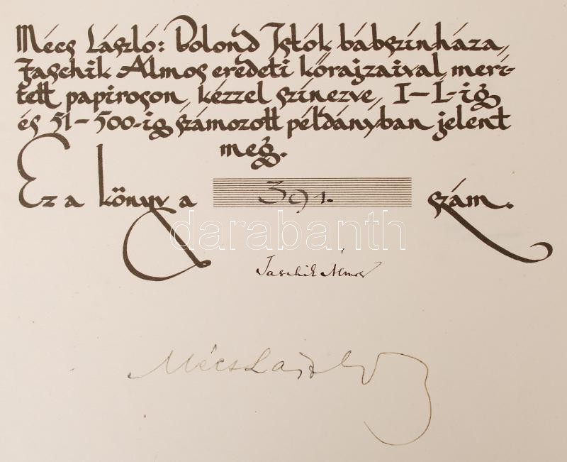 Leírás: Mécs László: Bolond Istók bábszínháza. Jaschik Álmos rajzaival. Bp., 1931, Napkelet. 31p. Jaschik Álmos egész oldalas, színezett kőrajzaival. 500 számozott példányból a 391. számú, kézzel számozott, aláírt példány. Fűzve, védőborító nélkül.
