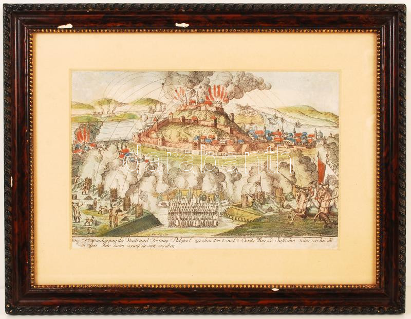 Leírás: cca 1700 Joseph Eder: Belgrád ostroma. Színezett rézmetszet. / cca 1700 Siege of Belgrade. Colored etching 28x18 cm paszpartuban, keretben / in frame