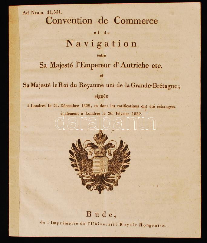 1830 Buda, Kereskedelmi és hajózási megállapodás I. Ferenc osztrák császár és Nagy-Britannia között(francia és angol nyelven), megkötésére 1829-ben került sor Londonban, 16p /