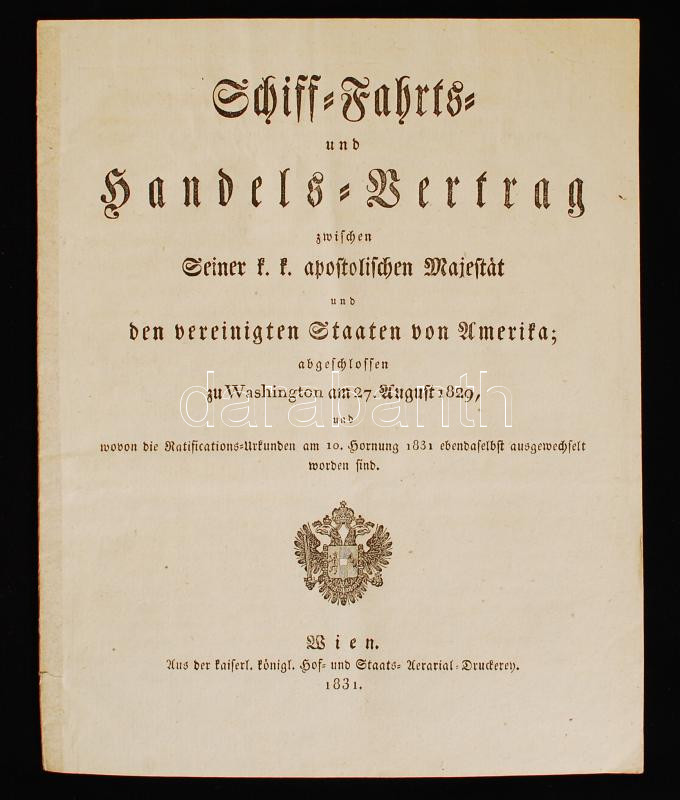 1831 Bécs, Hajózási és kereskedelmi megállapodás I. Ferenc osztrák császár és az Amerikai Egyesült Államok között(német és angol nyelven) egyenlő kereskedelmi jogok biztosításáról, megkötésére 1829-ben került sor Washingtonban, 14p /