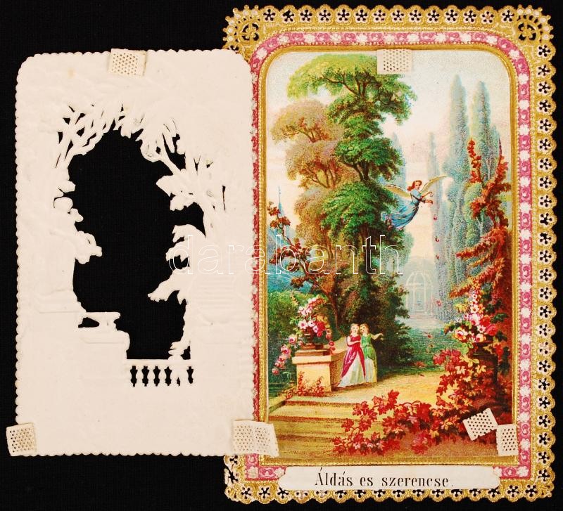 Leírás: 1867 Áldás és szerencse. Csipke litho üdvözlőkártya. Kinyitható. Kis szakadással. Hátoldalt ajándékozási feljegyzés / Embroided litho greeting card