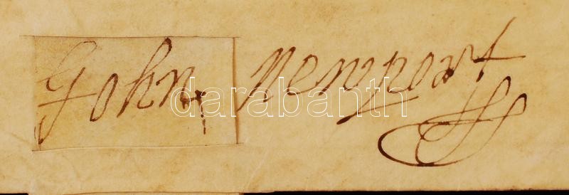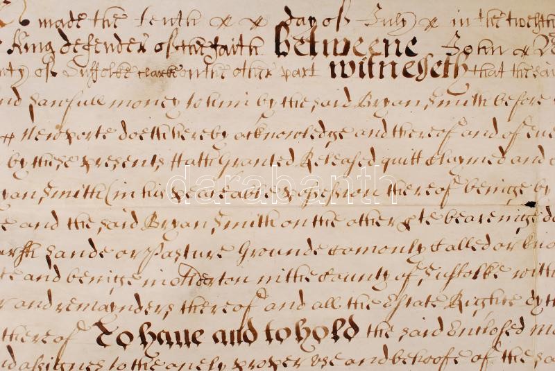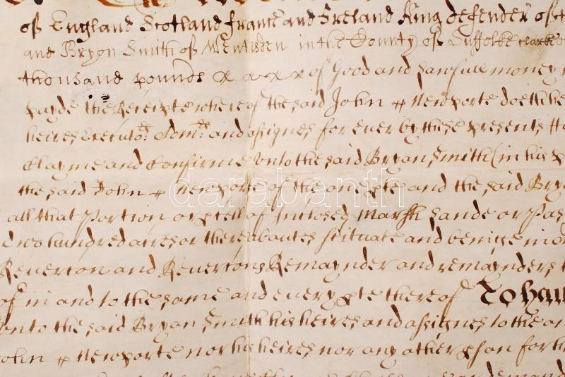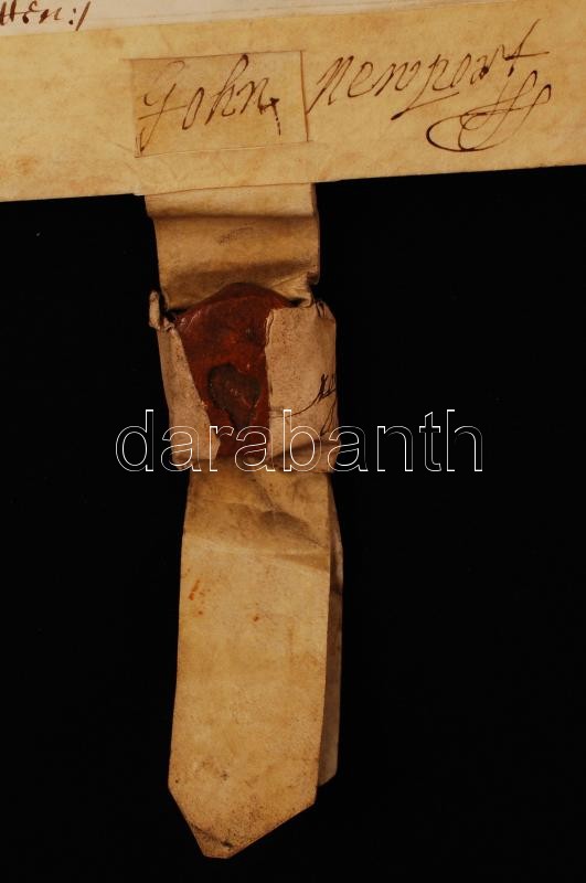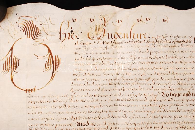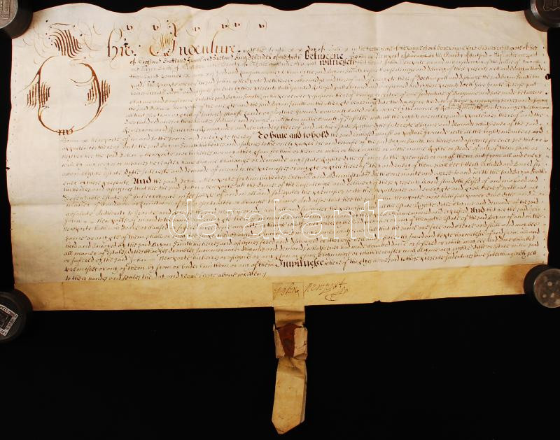 1661 Tulajdonátruházási szerződés Angliában, Suffolk megyében aldertoni ingatlan ügyében. Pergamenre írva, szépen kalligrafálva, függő viaszpecséttel. / 1661 Beautifully penned English vellum indenture, during the reign of King Charles II being the conveyance of property in Alderton in the County of Suffolk between John Newport of Hartford, an Esquire, and Bryan Smith. 58x32 cm