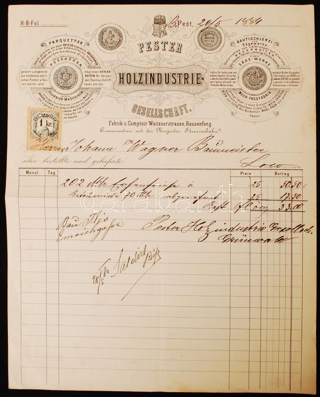 1886 Pester Holzindustrie fejléces számla / Invoice https://www.darabanth.com/hu/19-Nagyaukcio/19.1/Mutargy-papirregiseg/Okmanyok~6533/1886-Pester-Holzindustrie-fejleces-szamla-Invoice~II933843
