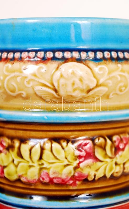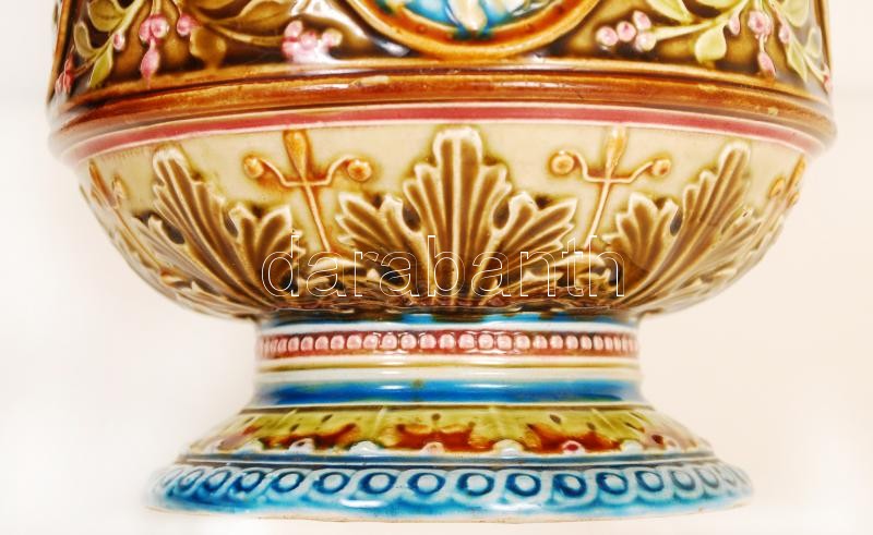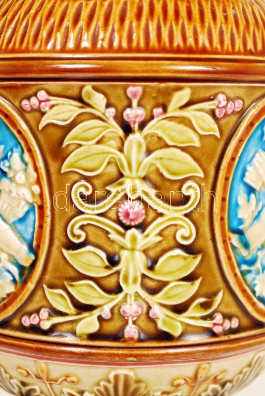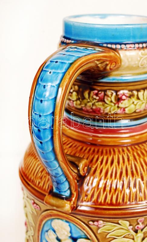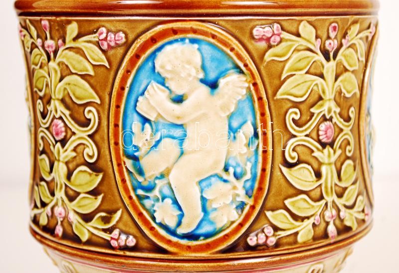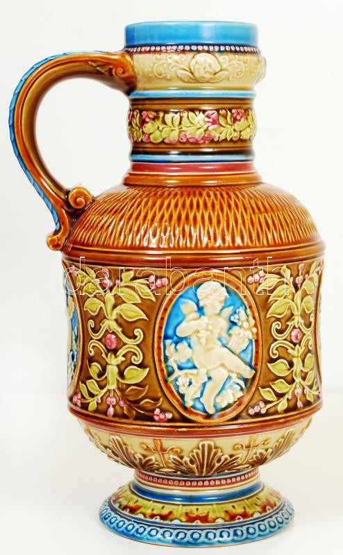 Leírás: cca 1900 Schütz Cilli angyalkás díszkancsó, kézzel festett mázas kerámia, jelzett, hibátlan / Hand painted, ornamented jug m:31 cm