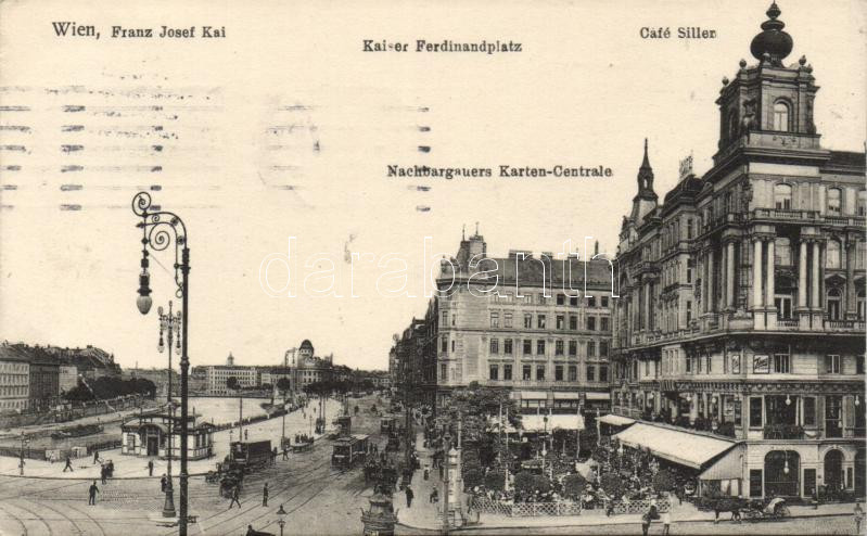 Leírás: Vienna, Wien; Franz Joseph Kai, Kaiser Ferdinandplatz, Café Siller, Nachbargauers Karten-Centrale (fa)