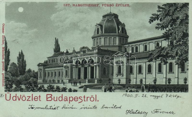 Leírás: Budapest XIII. Margitsziget, fürdőépület, litho