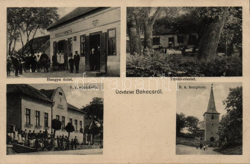 Leírás: Bekecs Hangya, fürdő, népiskola (fa)