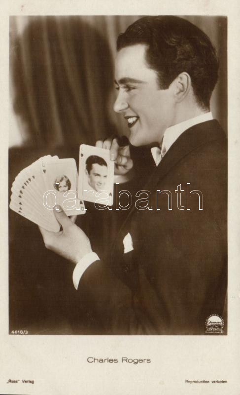 Charles "Buddy" Rogers with cards (fl) https://www.darabanth.com/hu/190-Gyorsarveres/190.0/Kepeslapok/Szinesz~800122/Charles-Buddy-Rogers-with-cards-fl~II716952