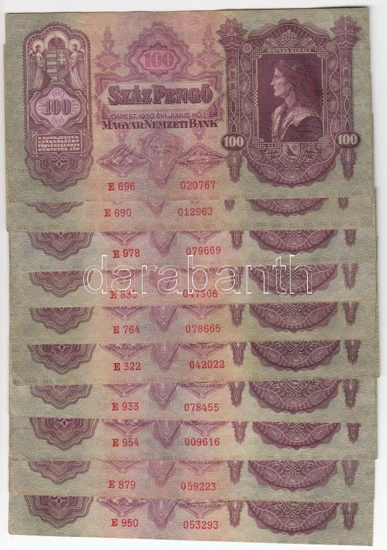 1930. 100P (10x) T:II-,III https://www.darabanth.com/hu/190-Gyorsarveres/190.0/Numizmatika/Magyar-bankjegyek~600007/1930-100P-10x-TII-III~II713253