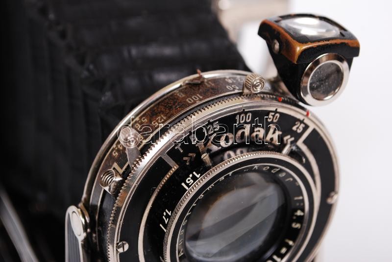 Leírás: 1934-1939 Kodak Vollenda 620 harmonikás fényképezőgép Kodak Anastigmat f4,5/105mm objektívvel, eredeti, viseltes állapotú tokjával /