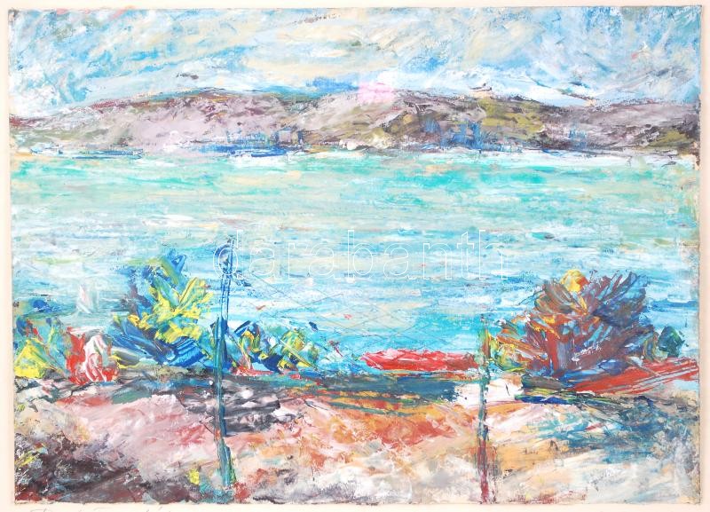 Leírás: Olvashatatlan jelzéssel: Balatoni táj. Olaj, karton-papír, üvegezett keretben, 25×36 cm