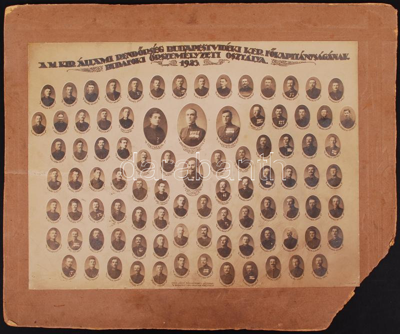 1923 1db tablókép a M. Kir. Állami Rendőrség Budapest vidéki főkapitányságának budafoki őrszemélyzeti osztályáról, 92 portréval, nevekkel, beosztásokkal ellátva, 22x29 cm.